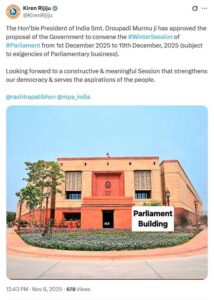 केंद्रीय मंत्री किरेन रिजिजू ने बताया कि राष्ट्रपति द्रौपदी मुर्मू ने 1-19 दिसंबर तक संसदीय सत्र के प्रस्ताव को मंजूरी दे दी है। उन्होंने ने एक्स पर इसकी जानकारी देते हुए कहा, “हम आशा करते हैं कि यह सत्र रचनात्मक और सार्थक साबित होगा, जो हमारे लोकतंत्र को मजबूत करेगा और लोगों की आकांक्षाओं को पूरा करेगा।”